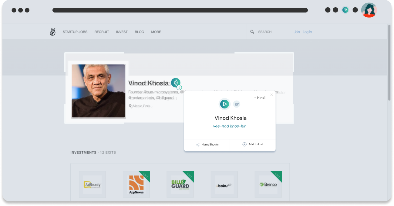 With NameShouts for Chrome enabled, you’ll see a green icon next to names we have pronunciations for. Click it to open up a Name Card, complete with audio and phonetic pronunciations.